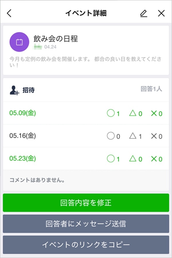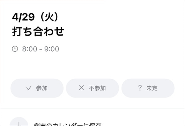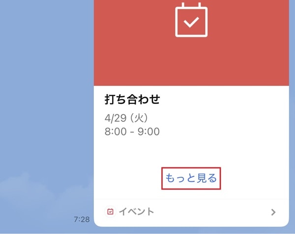 イベントを作成すると、トークにメッセージが表示されます。「もっと見る」から詳細の確認や参加/不参加/未定の選択(設定した場合)などが可能です。
