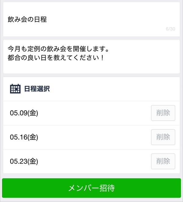 トークルームで「+」>「日程調整」の順にタップすると、作成画面が開きます。イベント名、イベント内容、候補の日程を入力して、「メンバー招待」>「送信」まで実行しましょう。