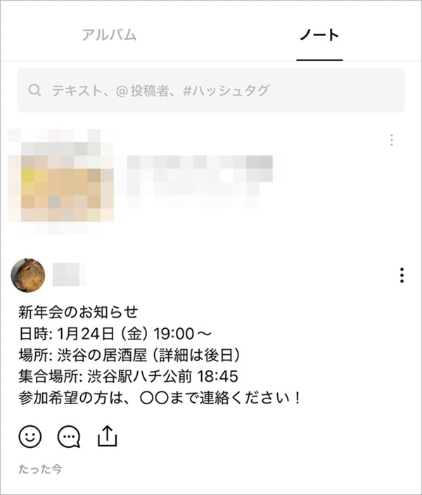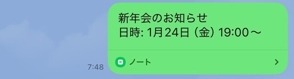 トークルーム上にも、ノートを作成するとメッセージが送信されます。こちらをタップすると、上記のノートが開きます。