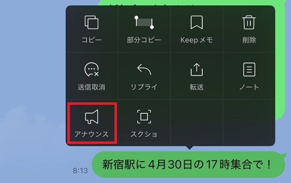アナウンスしたいメッセージを長押ししてメニューを表示し、「アナウンス」をタップすると、画面上部にメッセージを固定できます。