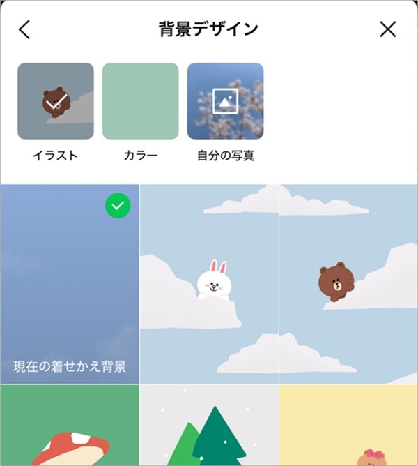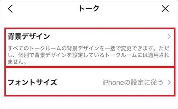 なお、個別のトークでの背景デザインは、各トークルームの三本線のメニュー>「設定」>「背景デザイン」から変更できます。