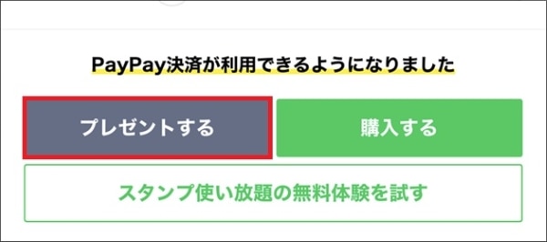 スタンプの購入画面から「プレゼントする」を選び、プレゼントする友だちを選んで決済をすると、友だちとのトーク画面でスタンプをプレゼントできます。