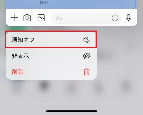 通知をオンに戻すには、該当のトークを長押しして「通知オン」をタップします。