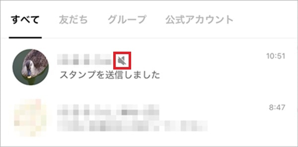 通知がオフになると、トークの一覧では通知オフのアイコンが表示されます。
