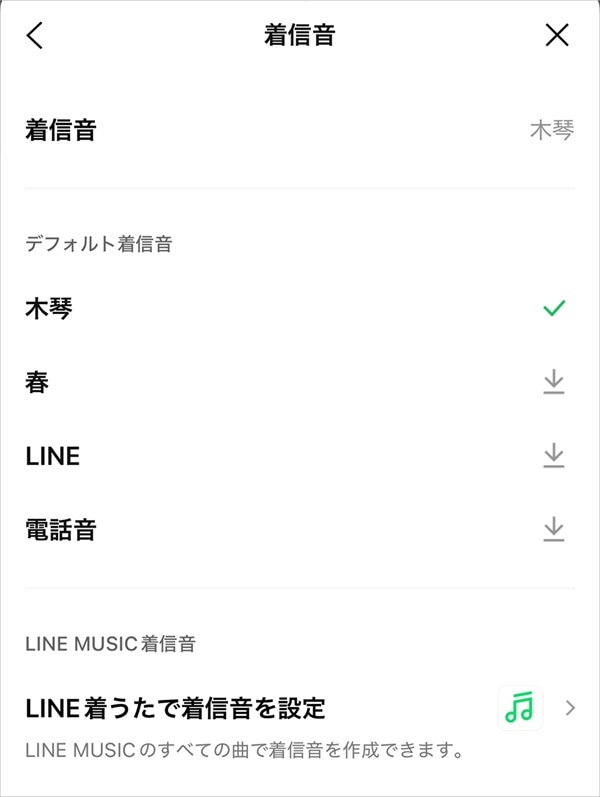 着信音は、デフォルトで選べるものとして「木琴」「春」「LINE」「電話音」が用意されています。そのほか、LINE MUSICの楽曲を着信音/呼出音にできる「LINE着うた」の設定も可能です。