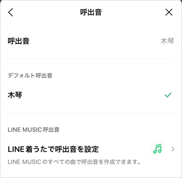 呼出音は、デフォルトのものとして「木琴」のみが選べます。そのほか、LINE着うたを呼出音に設定することもできます。