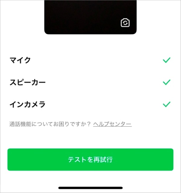 通話機能テストを開くと、すぐにテストが実行され、正常であれば各項目にチェックが入ります。「テストを再試行」から再度テストを実行することも可能です。