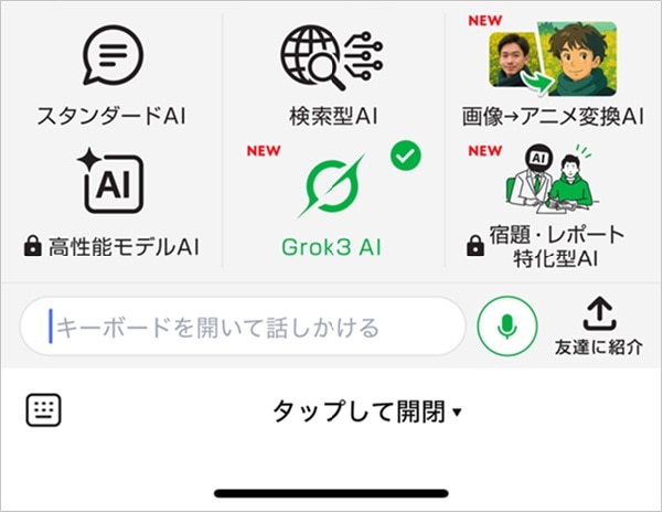 ・LINE AI トークサジェスト:メッセージ入力欄の「AI」アイコンをタップすると、返信・スタンプの提案機能や口調の変換機能が利用できる機能