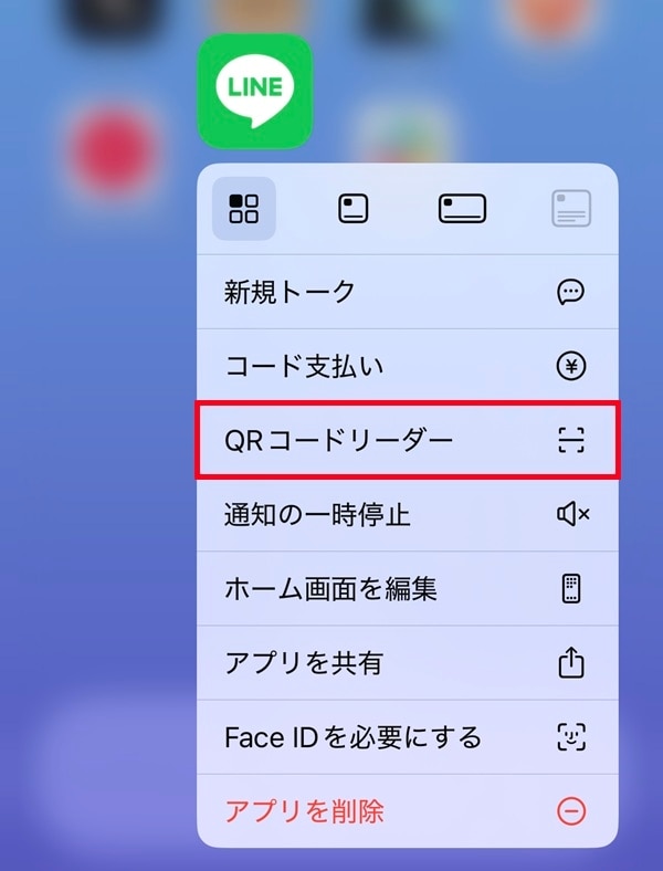 LINEアプリアイコンの長押しで表示されるメニューから「QRコードリーダー」を選択して、すぐにQRコードリーダーを起動できます。
