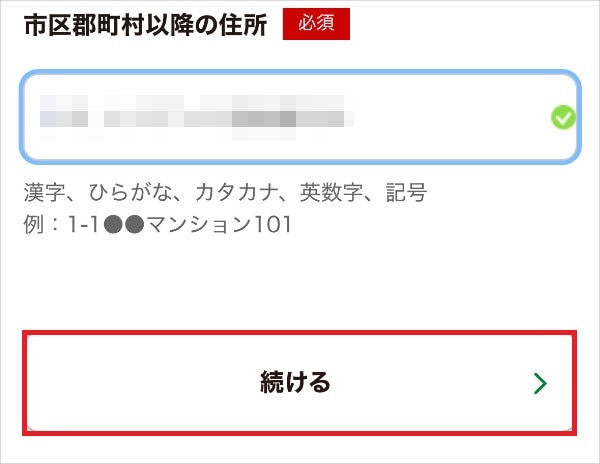5.氏名、性別、電話番号、郵便番号、住所(都道府県、市区郡・町村、市区郡以降の住所)を入力して、「続ける」をタップする