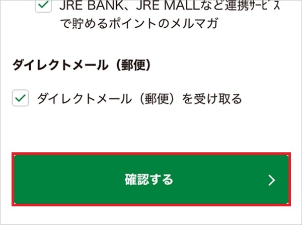 8.お知らせ設定(メルマガ・ダイレクトメール)について任意の設定を行う。必要なものにチェックを入れて、「確認する」をタップする
