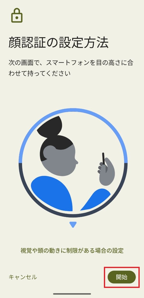 5.顔認証の設定方法画面が表示されたら、内容を確認し「開始」をタップ