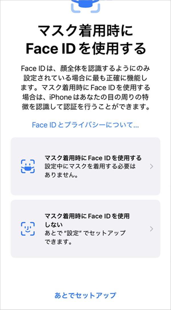 マスク着用時の設定が必要ない場合は、「マスク着用時にFace IDを使用しない」または「あとでセットアップ」をタップし、画面の指示に従って登録を完了させましょう。