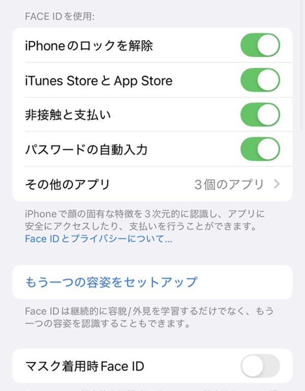 「Face IDとパスコード」の画面では、顔認証について以下の項目も設定できます。