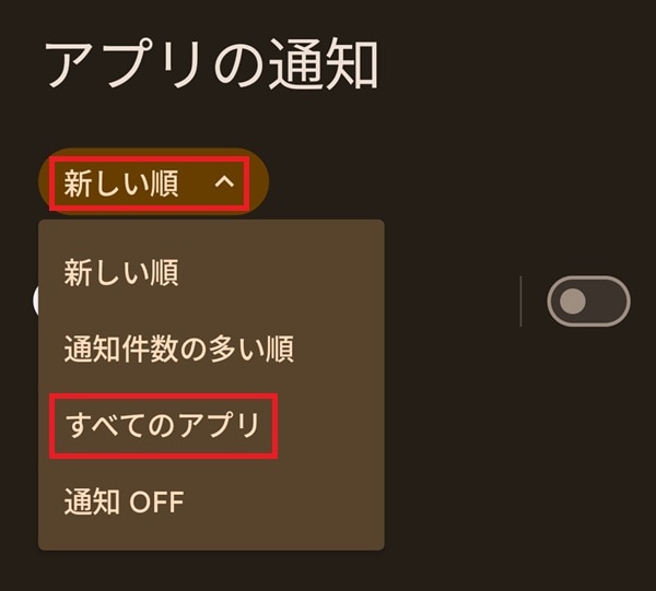 2.プルダウンをタップし、「すべてのアプリ」をタップする