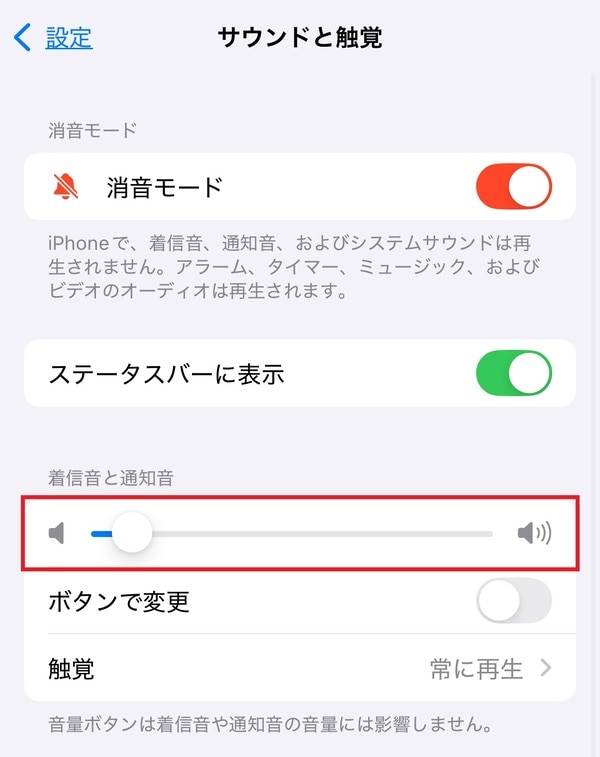 3.「着信音と通知音」のスライダをドラッグし、音量を変更する