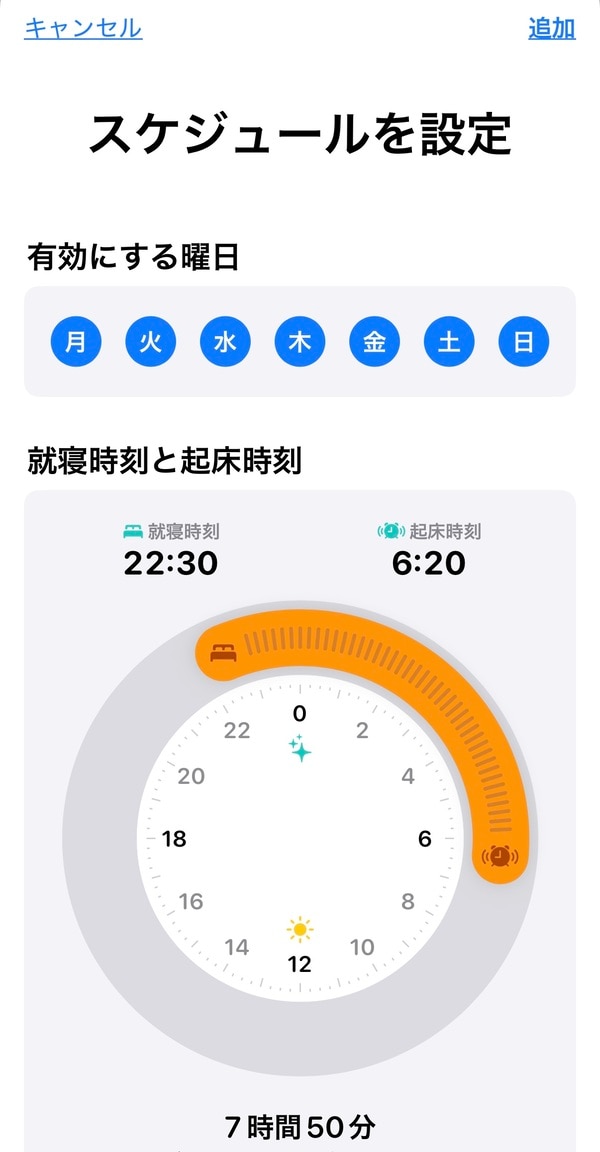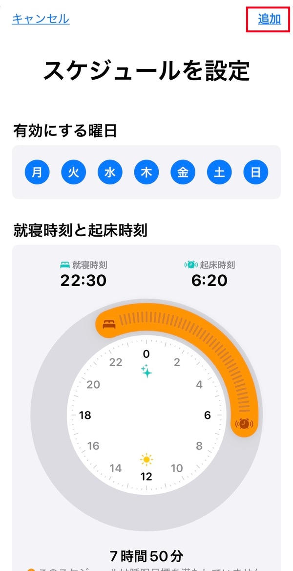 7.スケジュールを有効にする曜日、就寝時刻と起床時刻を設定する