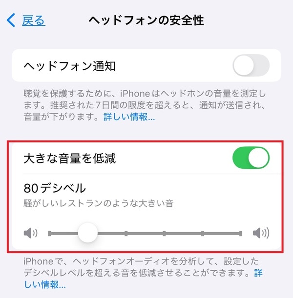 4.「大きな音量を低減」をオンにし、スライダを左右にドラッグして調整する