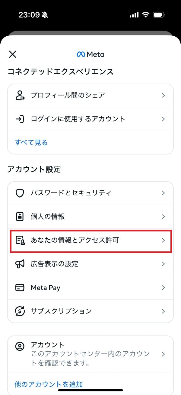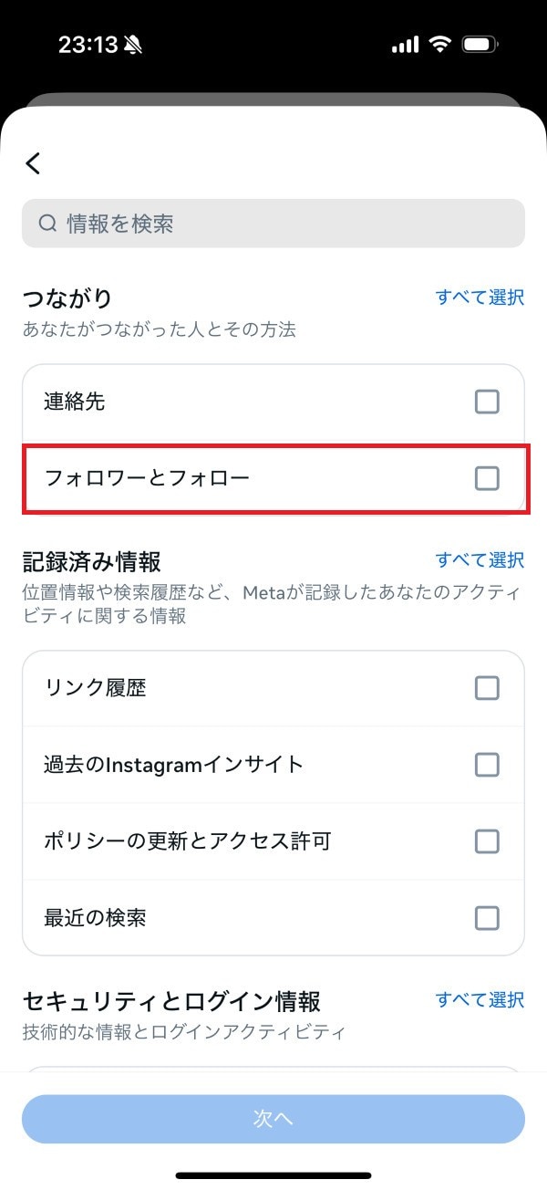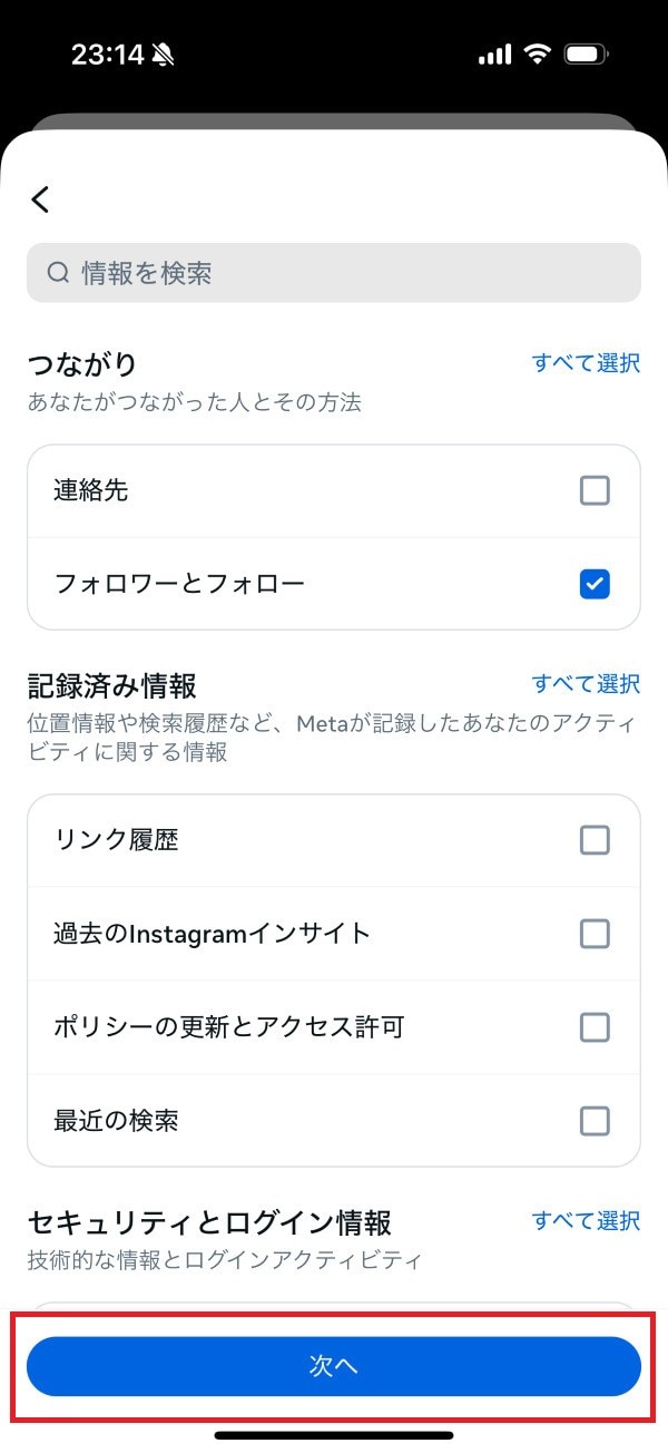 8.「アカウントとプロフィール」から、情報を取得したいアカウントもしくはプロフィールを選択して「次へ」をタップする