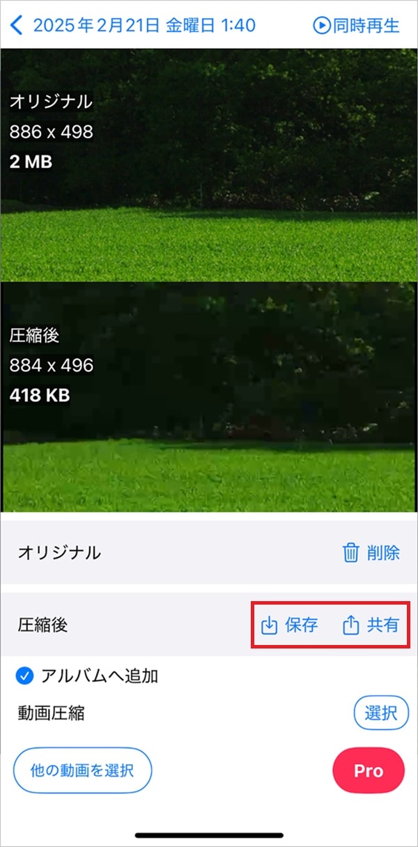 圧縮完了後に以下のような画面が表示されます。iPhone本体に保存する場合は「保存」、誰かに共有する場合は「共有」をタップしましょう。