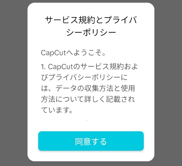 1.「CapCut」アプリをダウンロードしてはじめて利用する際は、規約・プライバシーポリシーへの同意や、いくつかの質問への回答(利用用途など)などが求められます。