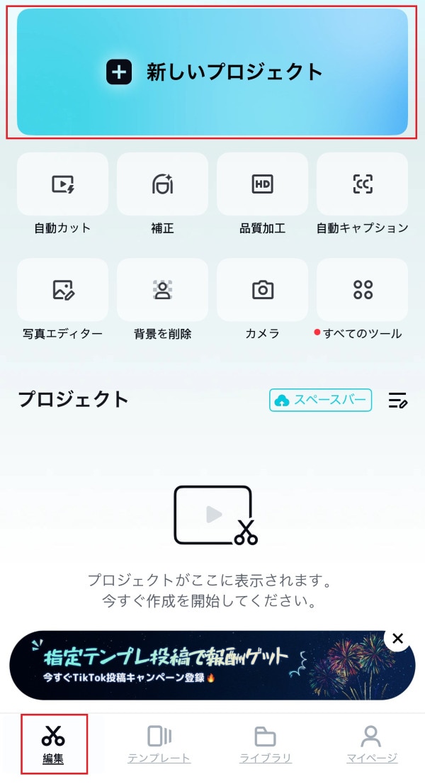 2.アプリが開いたら「編集」タブの「新しいプロジェクト」をタップします。写真と動画へのアクセス権を求められるので、希望に応じて選んでください。