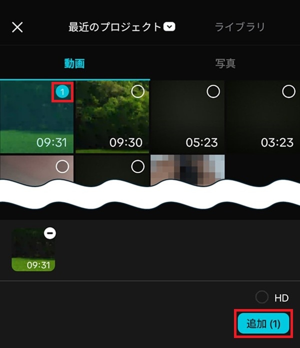 3.「動画」タブで圧縮する動画にチェックを入れて、画面下部の「追加」をタップします。