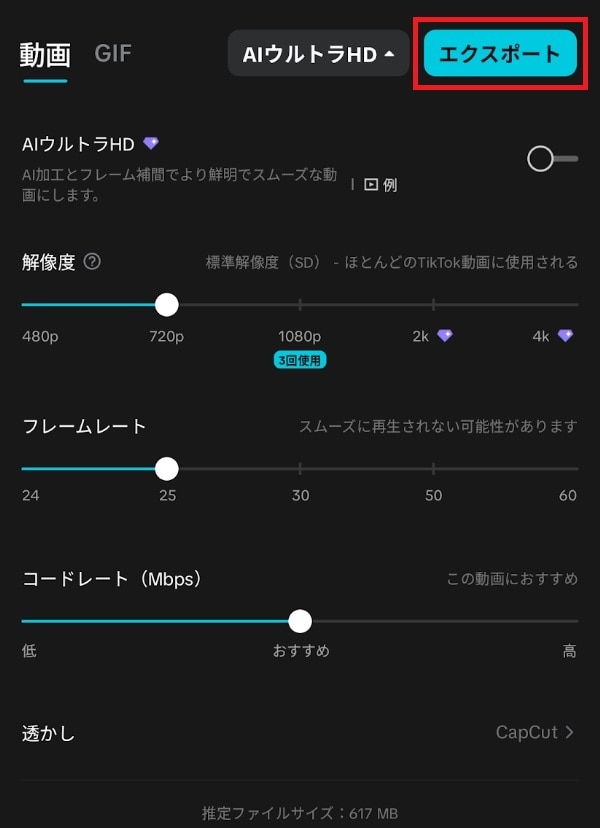 5.解像度、フレームレート、コードレートなどを調整できます(ダイヤのアイコンの項目は有料のCapCut Proで利用できる機能です)。調整後に「エクスポート」をタップします。