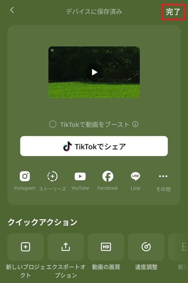 また、以下のような画面が表示され、圧縮した動画の共有や各種クイックアクションが選択できます。特に行わない場合は、画面右上の「完了」ボタンで完了します。