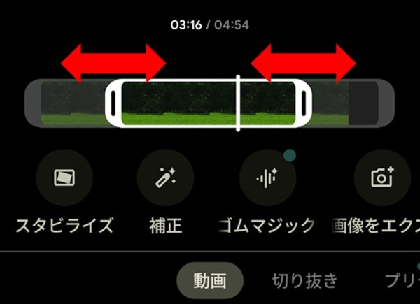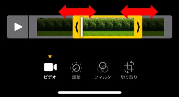 2.選択範囲を示す枠の左右両端にあるマークをドラッグして動画の前後をカットします。