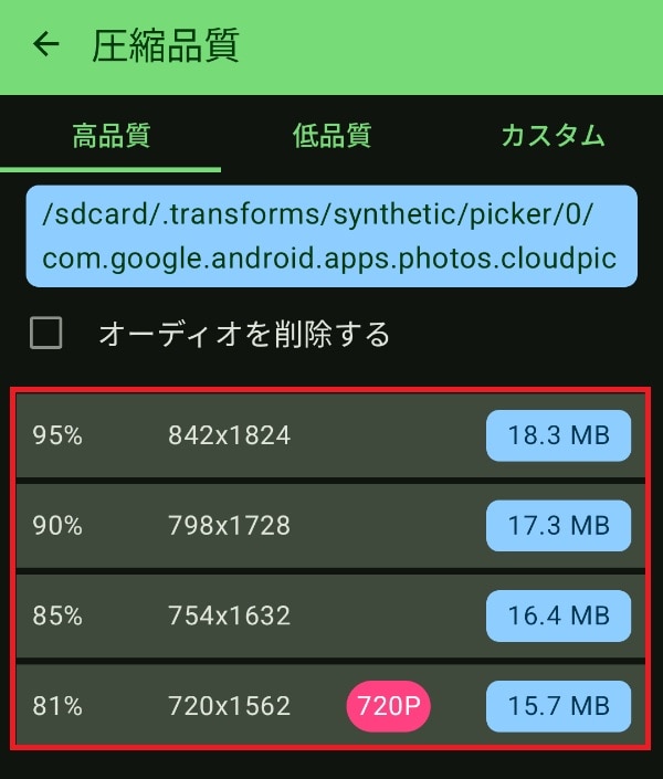 4.動画の圧縮品質をタブで選択できます。「高品質」「低品質」では、提示された選択肢から解像度を選んで圧縮が可能です。
