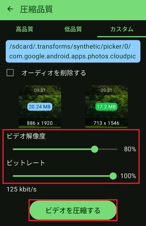 5.「カスタム」のタブでは、「ビデオ解像度」や「ビットレート」を調整できます。こちらのタブでは、ビデオ解像度・ビットレートを調整後に「ビデオを圧縮する」をタップします。