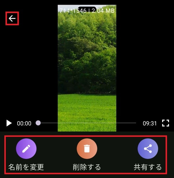 圧縮完了後に「名前を変更」「削除する」「共有する」が選択できます。特に行わない場合は、戻るボタン(←)で完了します。