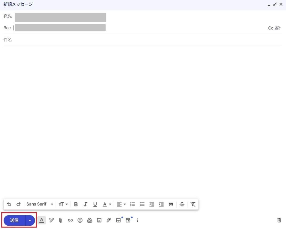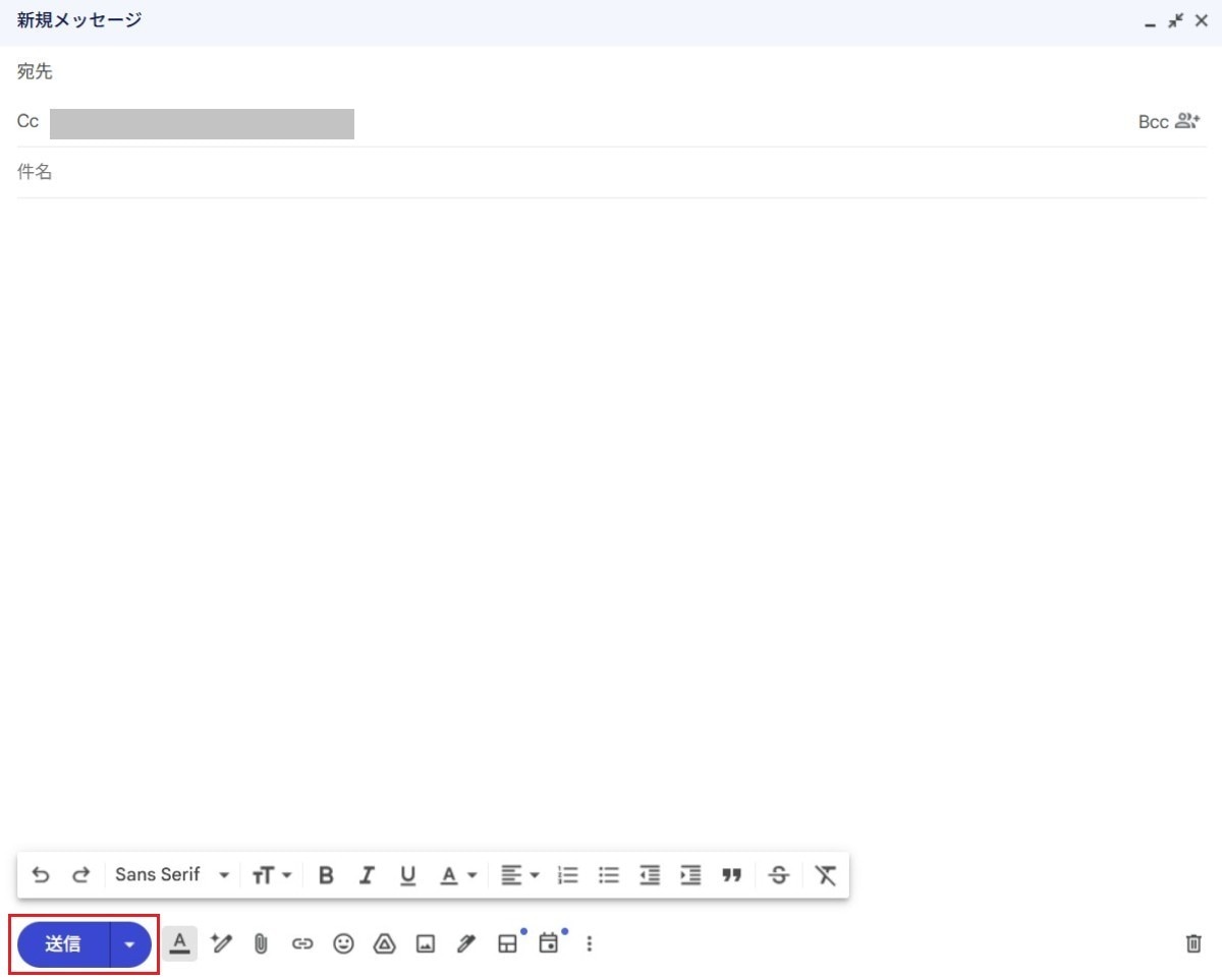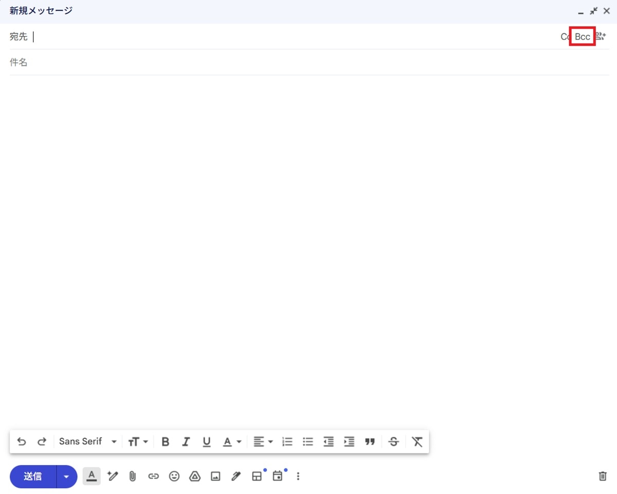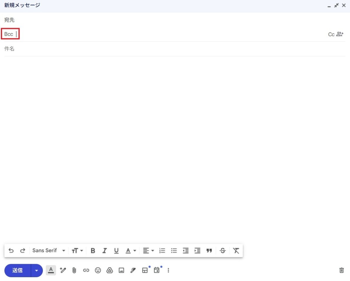 また、宛先欄、Cc欄にメールアドレスを入力しなくても、Bcc欄にメールアドレスを入力したまま「送信」を選択するとメールが送信されます。この場合、受信者は「誰宛のメールなのか」がわからず、不信感を与えるおそれがあるため注意しましょう。