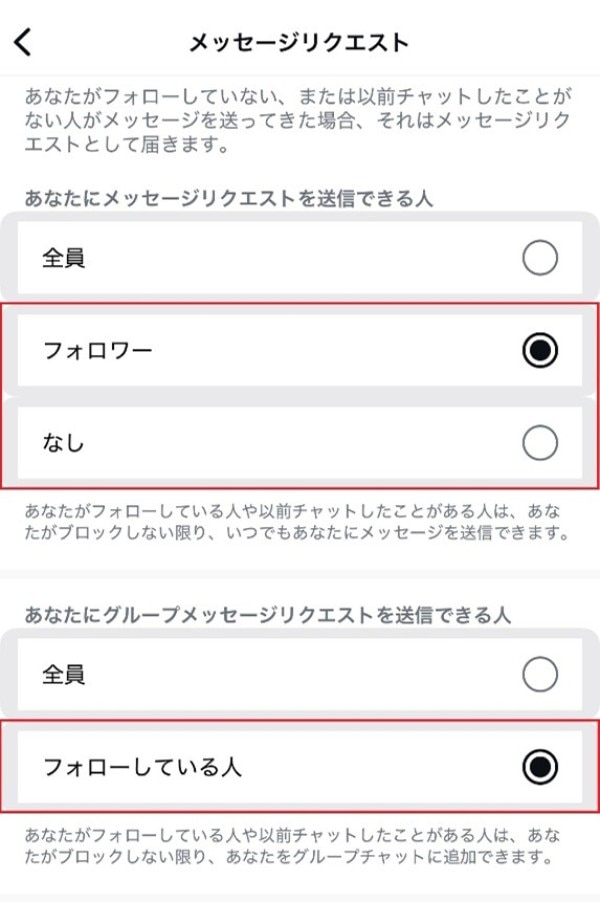 4.「あなたにメッセージリクエストを送信できる人」の項目で「フォロワー」もしくは「なし」、「あなたにグループメッセージリクエストを送信できる人」の項目で「フォローしている人」を選択する