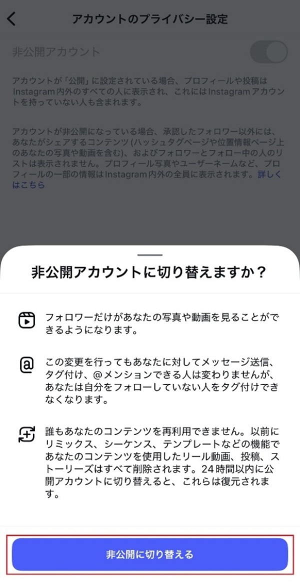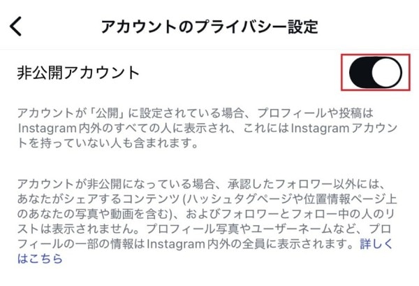 4.「非公開アカウント」のボタンをタップしてオンに切り替える