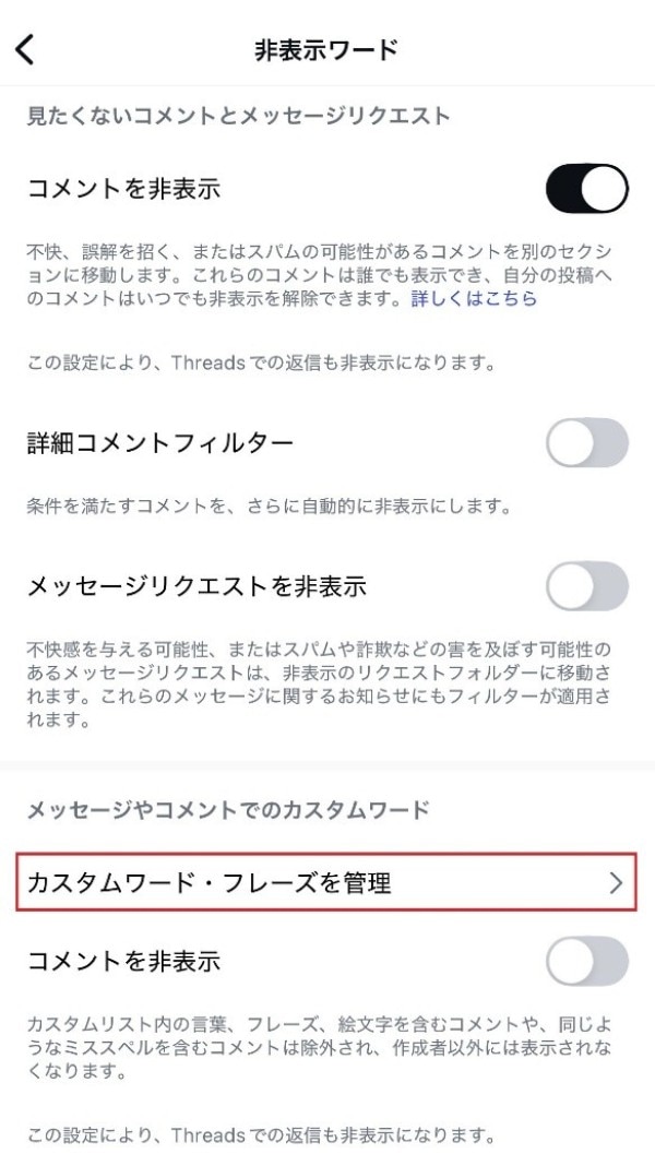 2.「非表示ワード」>「カスタムワード・フレーズを管理」の順にタップする