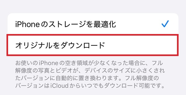 iPhoneのストレージ最適化は、「設定」>「ユーザ名」>「iCloud」>「写真」で「オリジナルをダウンロード」を選択するとオフにできます。