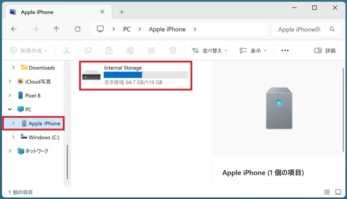 iPhoneのDCIMフォルダーは、写真や動画などのメディアファイルが保存されている場所です。「PC」の中の「Apple iPhone」>「Internal Storage」を順に選択すると表示できます。