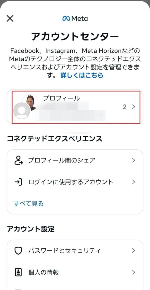 なお、「アカウントセンター」では、「ユーザーネーム」以外に「名前」や「プロフィール写真」、「アバター」を変更できるため、変更したい場合は該当の項目をタップしましょう。