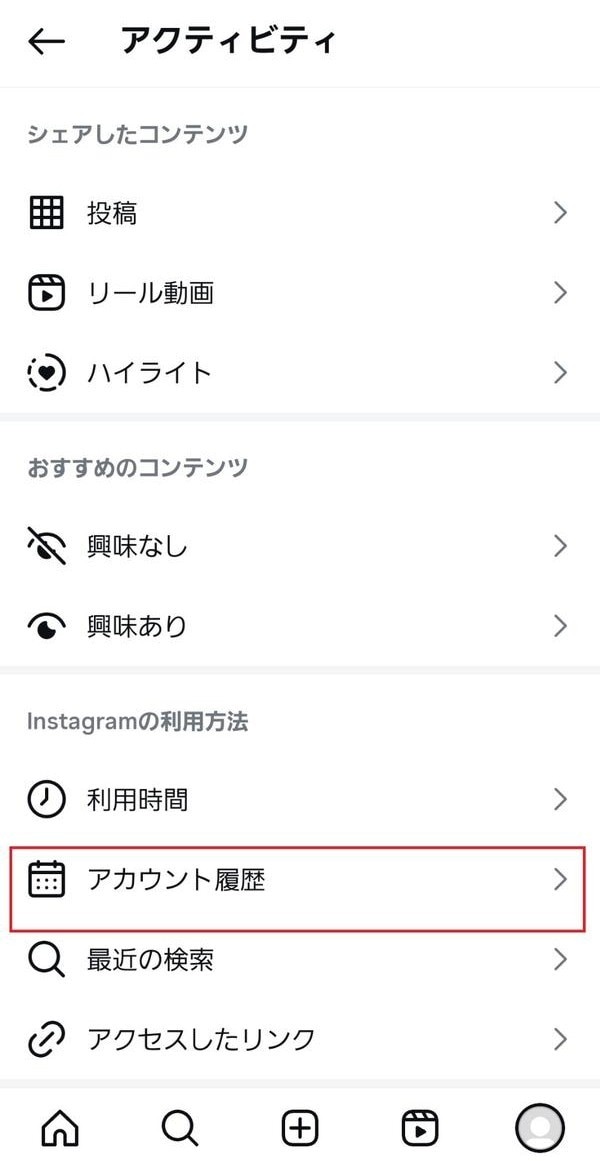 5.「アカウント履歴」をタップする