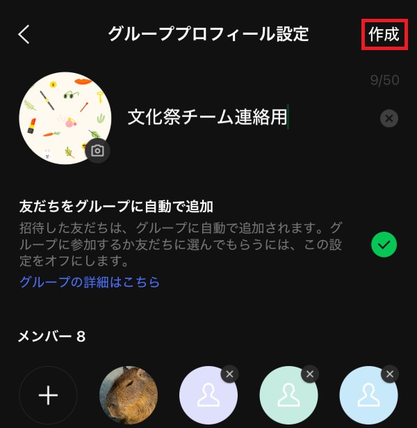 4.グループ名・グループのプロフィール画像や「友だちをグループに自動で追加」のオン/オフを設定し、「作成」をタップする