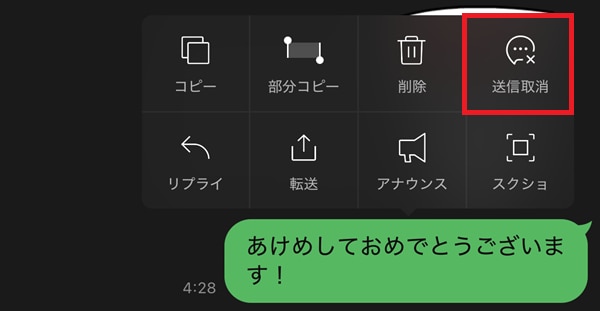取り消したいメッセージを長押ししてメニューを表示し、「送信取消」をタップして画面の表示に沿って操作すれば、取り消し完了です。