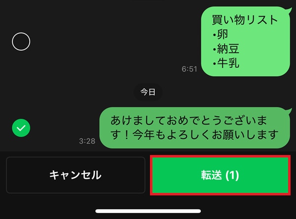 5.転送するメッセージが選択されているのを確認して「転送」をタップする