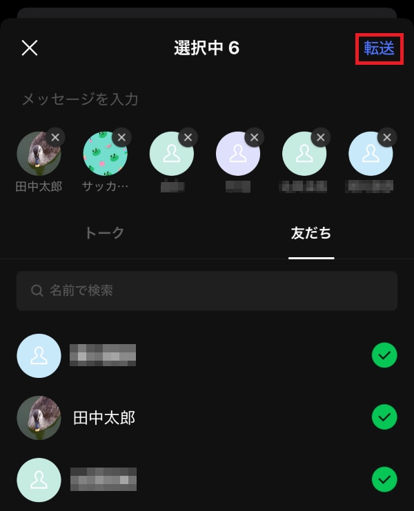 7.一覧から一斉送信する相手をすべて選択し、「転送」をタップする