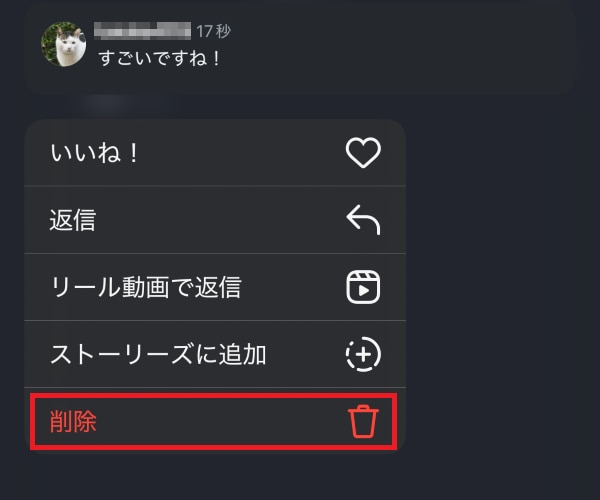 コメントを削除するには、コメントを長押しすると表示されるメニューから「削除」をタップします。誤ってコメントしてしまったときも、焦らず削除しましょう。