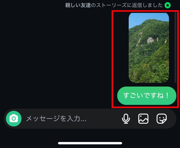 ストーリーズでは、広く公開されるコメントのほかに、投稿者に直接メッセージを送れる機能もあります。ストーリーズへのメッセージは、DM(ダイレクトメッセージ)で相手に届きます。