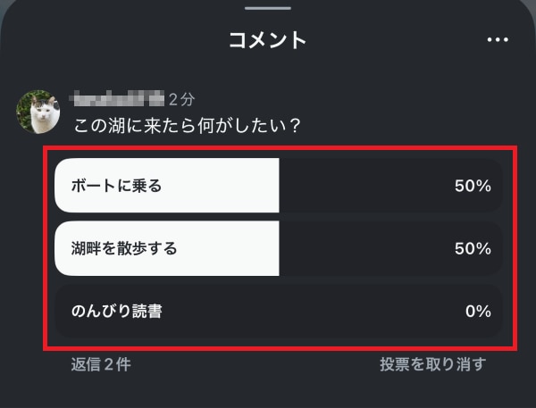 フィードやリールでは投稿の際に、自由に選択肢を設定してアンケートを付けられます。ユーザーは投稿のコメント欄からアンケートに投票できます。