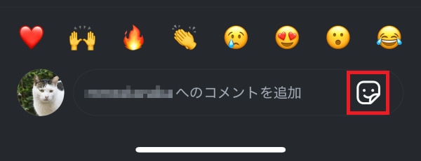 また、フィードやリールのコメントでは、GIFでのコメントも可能です。コメント入力欄の右にあるアイコンをタップして、表示される一覧からGIFを選んでタップするとコメントとして投稿できます。