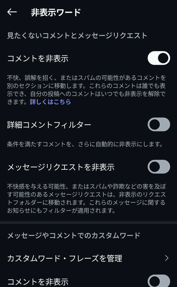 Android™の場合は、コメントの非表示などに関するさらに細かい設定が可能です。非表示にするワードもこの画面で設定できます。